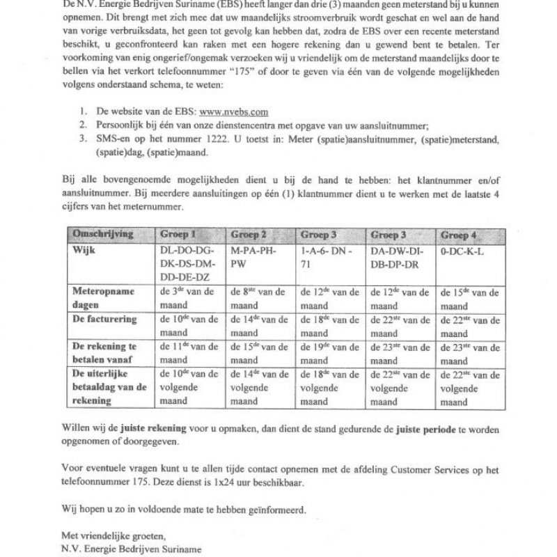 Voor de EBS is het belangrijk dat de rekening wordt bepaald op basis van het juiste verbruik. Als de klant bij wie de meterstand langer dan 10 maanden niet is opgenomen, de stroomrekening komt voldoen wordt de betaling niet geaccepteerd en wordt die klant verwezen naar de afdeling Klantenservice waar er een afspraak wordt gemaakt voor de meteropname of mag de klant zelf de huidige meterstand doorgeven. Zodra de EBS over de juiste meterstand beschikt wordt de blokkering van de rekening opgeheven.