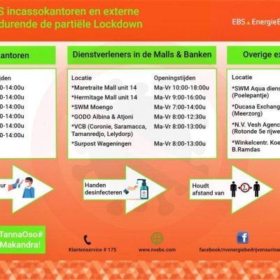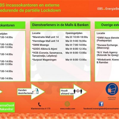 PARAMARIBO 26 juni 2020- Aangepaste openingstijden EBS incassokantoren en externe dienstverleners gedurende de partiële lockdown